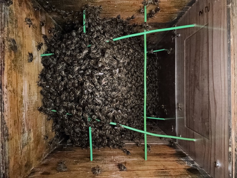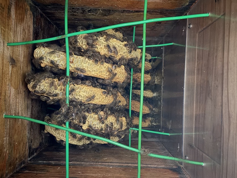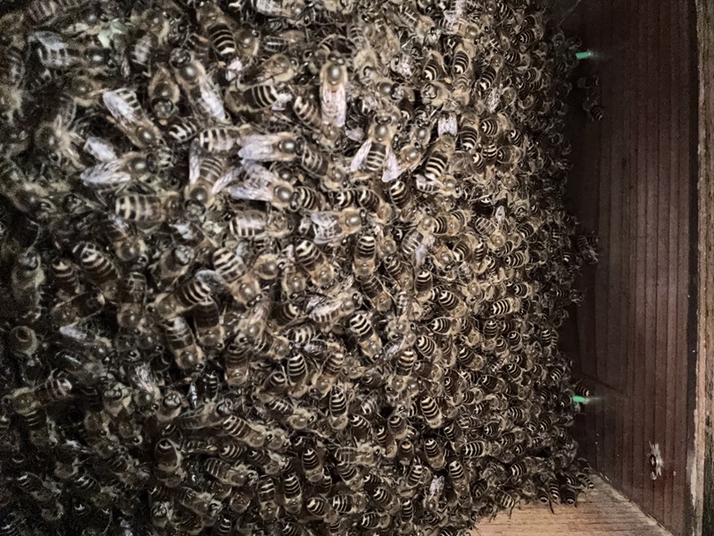 21℃ | 毎月の経過観察 入巣後2ヶ月が経過、益々、働き蜂の活動も激しく今にも分蜂するかもという思いで内見をしたところ、巣房の先端が見えているのを確認。孫分蜂してしまったかの思いでした。 | 孫分蜂 B棟2号巣箱に入巣 |